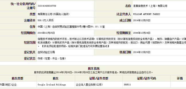 澎集信息成立于2014年12月25日,股東為Google Ireland Holdings(谷歌愛爾蘭控股),法人代表是William Anthony Farris,注冊資本為500萬元。該公司的經(jīng)營范圍包括:信息技術(shù)領(lǐng)域內(nèi)的技術(shù)開發(fā)、技術(shù)轉(zhuǎn)讓以及技術(shù)咨詢;計算機軟件的開發(fā)(除計算機信息系統(tǒng)安全專用產(chǎn)品)、制作,銷售自產(chǎn)產(chǎn)品;計算機系統(tǒng)集成;計算機軟件產(chǎn)品(除計算機信息系統(tǒng)安全專用產(chǎn)品)及其他組件的批發(fā)、進出口、傭金代理(拍賣除外)及其他相關(guān)配套業(yè)務(wù)。從澎集信息的經(jīng)營范圍上看,已經(jīng)涵蓋了谷歌此前撤出的業(yè)務(wù)內(nèi)容,包括網(wǎng)頁搜索和郵箱服務(wù)。歌或許期望,可以在上海自貿(mào)區(qū)享受“境內(nèi)關(guān)外”的政策,作為重返中國的第一步。 |  |  |  |  |  |